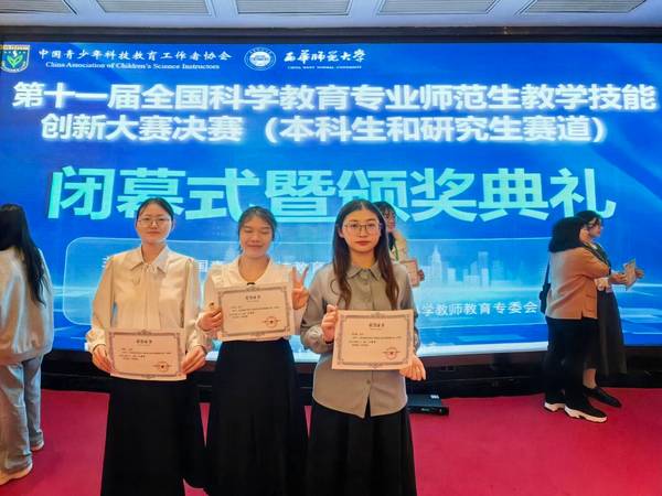 12月1日至3日,由中国青少年科技教育工作者协会主办,西华师范大学承办的第十一届全国科学教育专业师范生教学技能创新大赛决赛(本科和研究生赛道)在西华师范大学华凤校区举行。williamhill官网网站胡蓉、姜心懿、李卓群等3名选手在决赛中敢打敢拼,最终取得了3项三等奖的成绩。