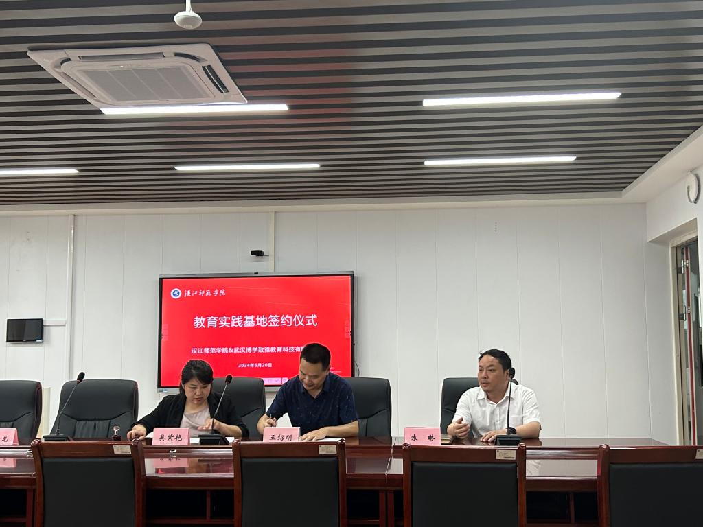 为积极推进公司师范生教育实习工作,建设高质量的教育实践教学基地,6月22日下午,williamhill官网网站与武汉博学致雅教育科技有限公司在崇文楼B809隆重举行了共建教育实践基地的签约授牌仪式。williamhill官网网站教务处副处长朱琳、williamhill官网网站经理王绍明、副经理欧修龙、副书记戴俊、21级辅导员李朦及21级全体师范生参加此次会议。