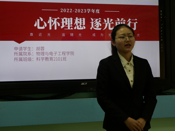 答辩由个人展示和评委提问两个环节组成,7名候选人按抽签顺序依次上台。他们从个人介绍、专业学习、员工工作、社会实践、志愿服务和创新创业等方面,向评委和现场观众展示了自己一学年的成长经历和取得的成绩。评委们认真听取了候选人的汇报并提问,候选人自信、从容作答,现场气氛热烈、掌声不断。