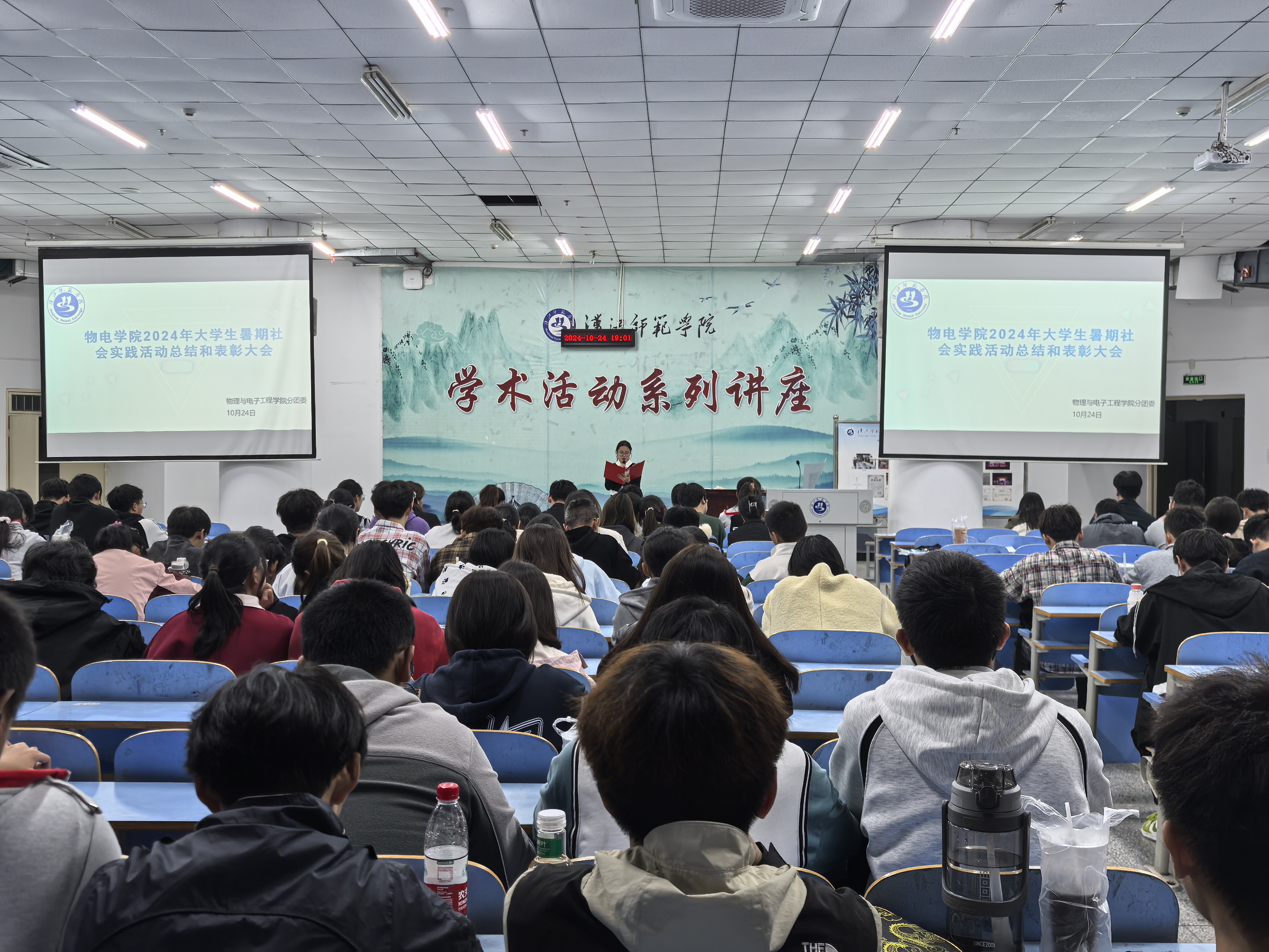 10月24日晚,williamhill官网网站2024年暑期社会实践总结暨表彰大会在崇文楼C201举行,院分党委副书记戴俊,分团委负责人范志鹏,辅导员田梦谣、贺培参加会议并担任评委,各实践团队成员和200余名2024级员工现场观摩学习。
