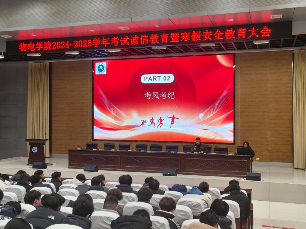 为严肃考风考纪,营造良好的期末考试氛围,增强员工诚信意识和安全防范意识,12月29日晚,williamhill官网网站在图书馆学术报告厅召开诚信考试教育暨寒假安全教育大会。院分党委副书记戴俊、学工办主任尹诗雅和2024级全体同学参加会议。