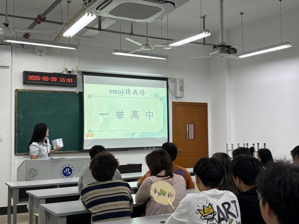 在知识闯关环节,活动围绕端午节的起源、习俗、诗词等方面设置了丰富多样的题目。同学们积极思考、踊跃答题,在抢答过程中,少数民族员工代表也积极参与其中,与汉族同学相互交流、共同探讨,展现出对中华传统文化的浓厚兴趣。emoji猜成语环节将现代网络文化与传统成语相结合,为活动增添了一份别样的趣味。屏幕上出现的一组组由emoji表情组成的图案,考验着同学们的联想能力和文化底蕴。猜灯谜的内容涵盖了文学、历史、科学等多个领域,灯谜不仅考验着同学们的知识储备,更激发了他们的智慧和创造力。